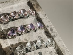 Flot clic-clac hårspænde med både små og store lyselilla rhinsten. Spændet måler 2,5 cm x 7,8 cm.