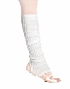 Hvide ribstrikkede benvarmere til gymnastik med hul til hælen. 60 cm. 91%acryl/7%elastan/2%andre fiber. 1 PAR