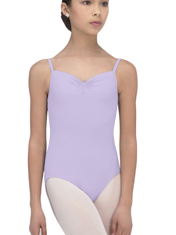 Flot lyselilla gymnastikdragt til piger med smalle stropper og rynke effekt. Dobbelt lag på fronten.