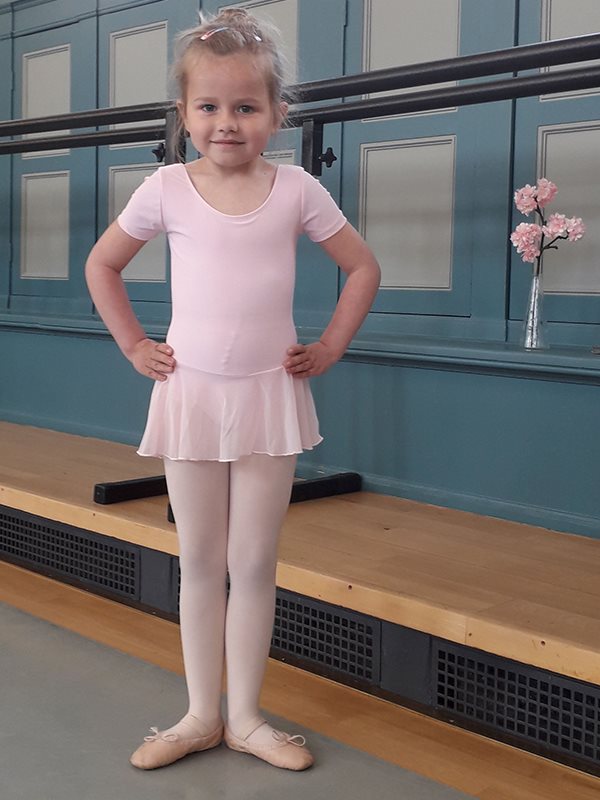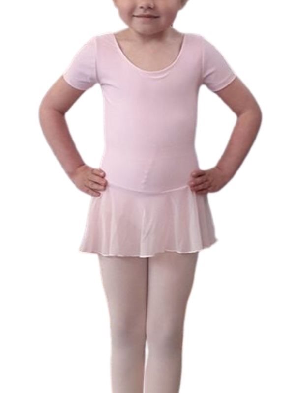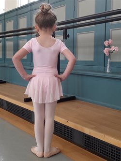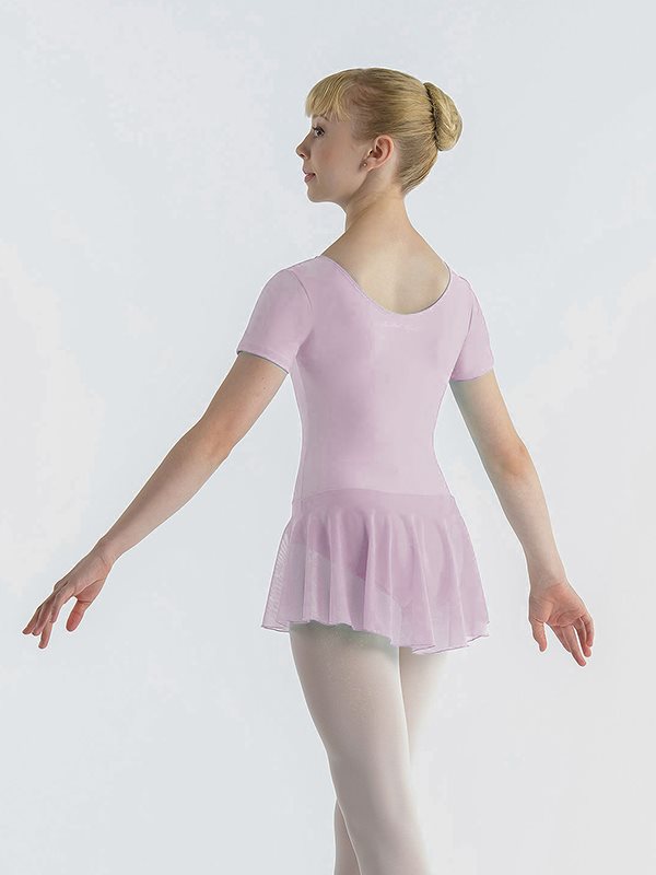 Lyserød gymnastikdragt fra Ballet Rosa i microfiber med påsyet chiffon skørt til piger og damer. Dragten har dobbelt lag på for stykket og korte ærmer. Diskret ton i ton logo på ryggen. Super pasform og kvalitet. 90% microfiber/10% elastan