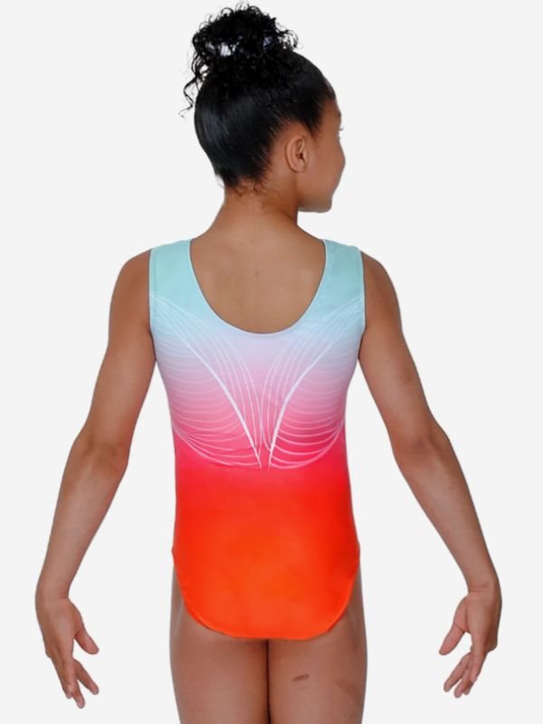 The zone gymnastikdragt til piger uden ærmer i flot farvekombination. Øverst svag lysegrøn, dernæst hvid og nederst koralrød