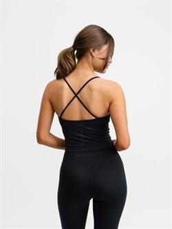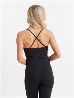 Den dybe, afrundede udskæring sammen med den åbne ryg skaber en forførende silhuet, mens de fine, tynde stropper understreger toppens unikke og tiltalende design. Med en indbygget bh og udtagelige indlæg tilbyder denne top både støtte og tilpasning, hvilket gør den perfekt til både træningspasset og som en stilfuld del af din hverdagsgarderobe.